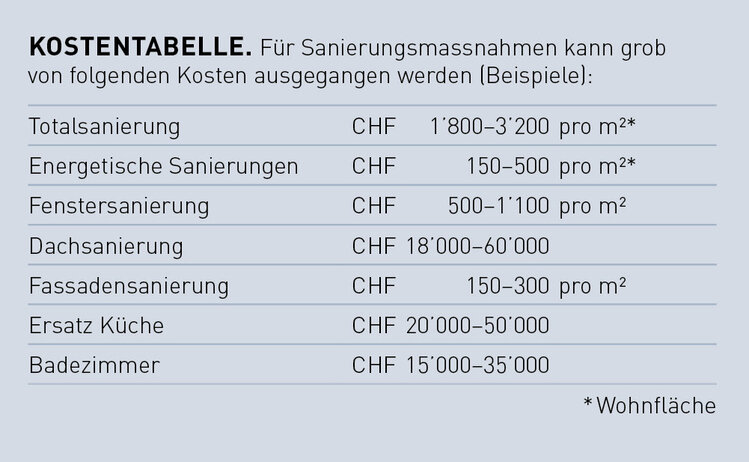 Ein strukturiertes Vorgehen sowie eine gute Planung vermeiden Konflikte und die Sanierung kann effizient bzw. erfolgreich durchgeführt werden. Zudem bieten Sanierungsmassnahmen steuerliche Vorteile (abzugsfähige Kosten, Verteilung auf mehrere Jahre).