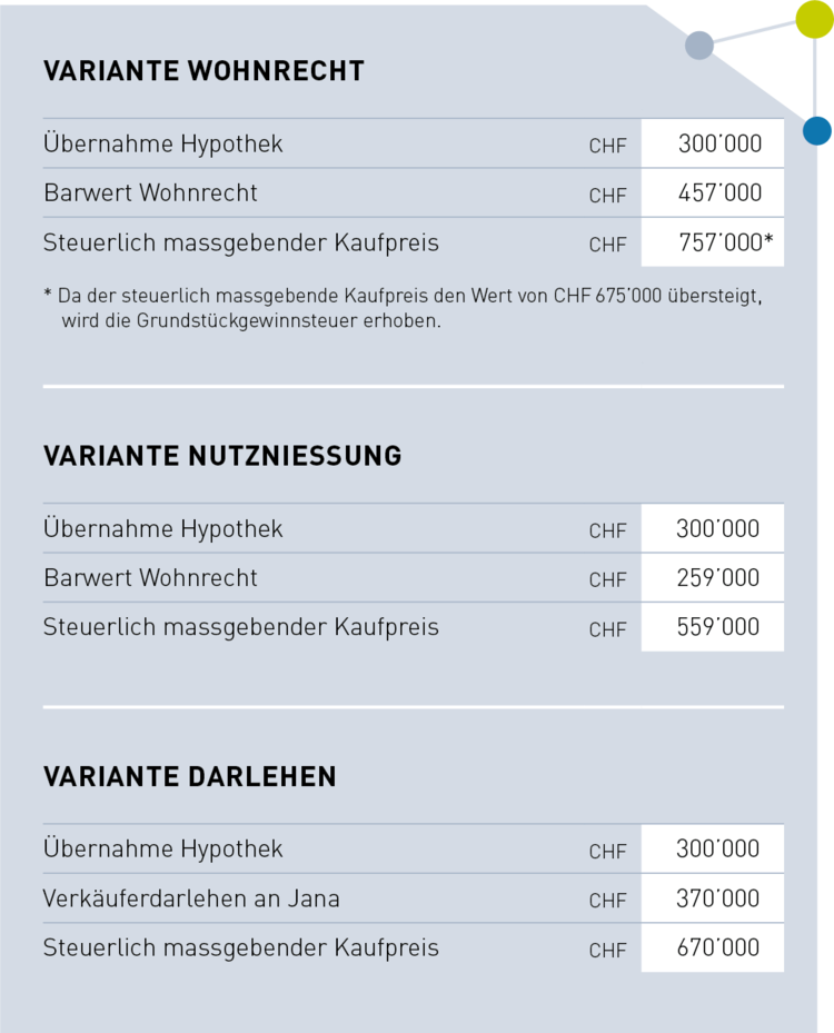 Der steuerlich massgebende Kaufpreis liegt bei den Varianten Nutzniessung und Darlehen unter CHF 675’000, womit der Aufschub gewährt wird. Ein Steueraufschub ist keine Steuerbefreiung – die Besteuerung wird nur bis zur nächsten steuerrelevanten Liegenschaftsübertragung aufgeschoben. Jana