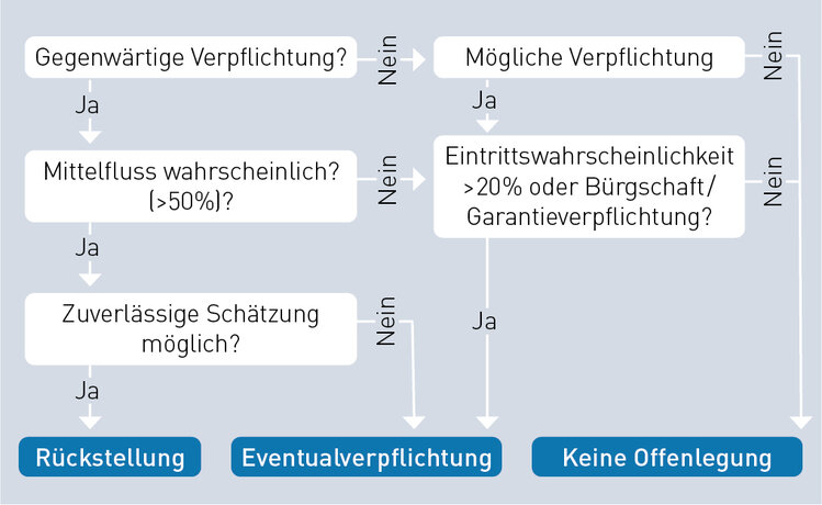 Als Eventualverbindlichkeiten gelten rechtliche oder tatsächliche Verpflichtungen, bei denen ein Mittelabfluss entweder als unwahrscheinlich erscheint oder in der Höhe nicht verlässlich geschätzt werden kann. Eventualverbindlichkeiten haben wirtschaftlich den gleichen Hintergrund wie Rückstellungen. Dabei handelt es sich um sämtliche am Bilanzstichtag bestehende und erkennbare Risiken und Lasten, welche aufgrund von rechtlichen oder faktischen Verpflichtungen eingegangen wurden. Dies können z.B. Garantieverpflichtungen, Solidarschuldverhältnisse, Bürgschaften, Konventionalstrafen, Verluste aus Liefer- und Abnahmeverpflichtungen, Rücknahmeverpflichtungen oder auch offene Rechtsstreitigkeiten und Prozessrisiken sein. Im Gegensatz zu den buchungspflichtigen Rückstellungen sind Eventualverbindlichkeiten lediglich im Anhang offenlegungspflichtig, da die Eintrittswahrscheinlichkeit eines verpflichtenden Ereignisses erheblich tiefer eingeschätzt wird, oder – trotz Bestehen eines verpflichtenden Ereignisses – die Höhe des Mittelabflusses nicht verlässlich abschätzbar ist. Bei der Beurteilung der Eintrittswahrscheinlichkeit des Mittelabflusses kann das folgende Schema hilfreich sein. Dieses zeigt auf, dass bei einer Eintrittswahrscheinlichkeit von unter 20% auf den Ausweis im Anhang der Jahresrechnung verzichtet werden kann.